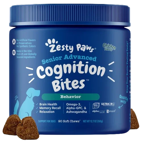 Stay Sharp, Fido! - Zesty Paws Advanced Cognition Bites are chewable supplements with premium ingredients that help with cognitive function, stress, clarity, and focus for your canine companion